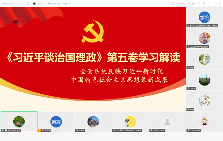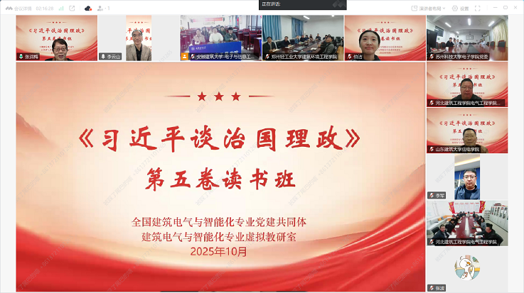 本网讯 为深入学习贯彻习近平新时代中国特色社会主义思想,推动师生党员在深学细悟笃行、深化内化转化上下功夫,切实把学习成果转化为推动事业发展的实际成效,2025年10月20日下午,全国建筑电气与智能化专业党建共同体通过建筑电气与智能化专业虚拟教研室平台成功举办专题学习《习近平谈治国理政》第五卷读书班。来自共同体成员单位的党委(总支)负责人、支部书记及师生党员近300人参加。