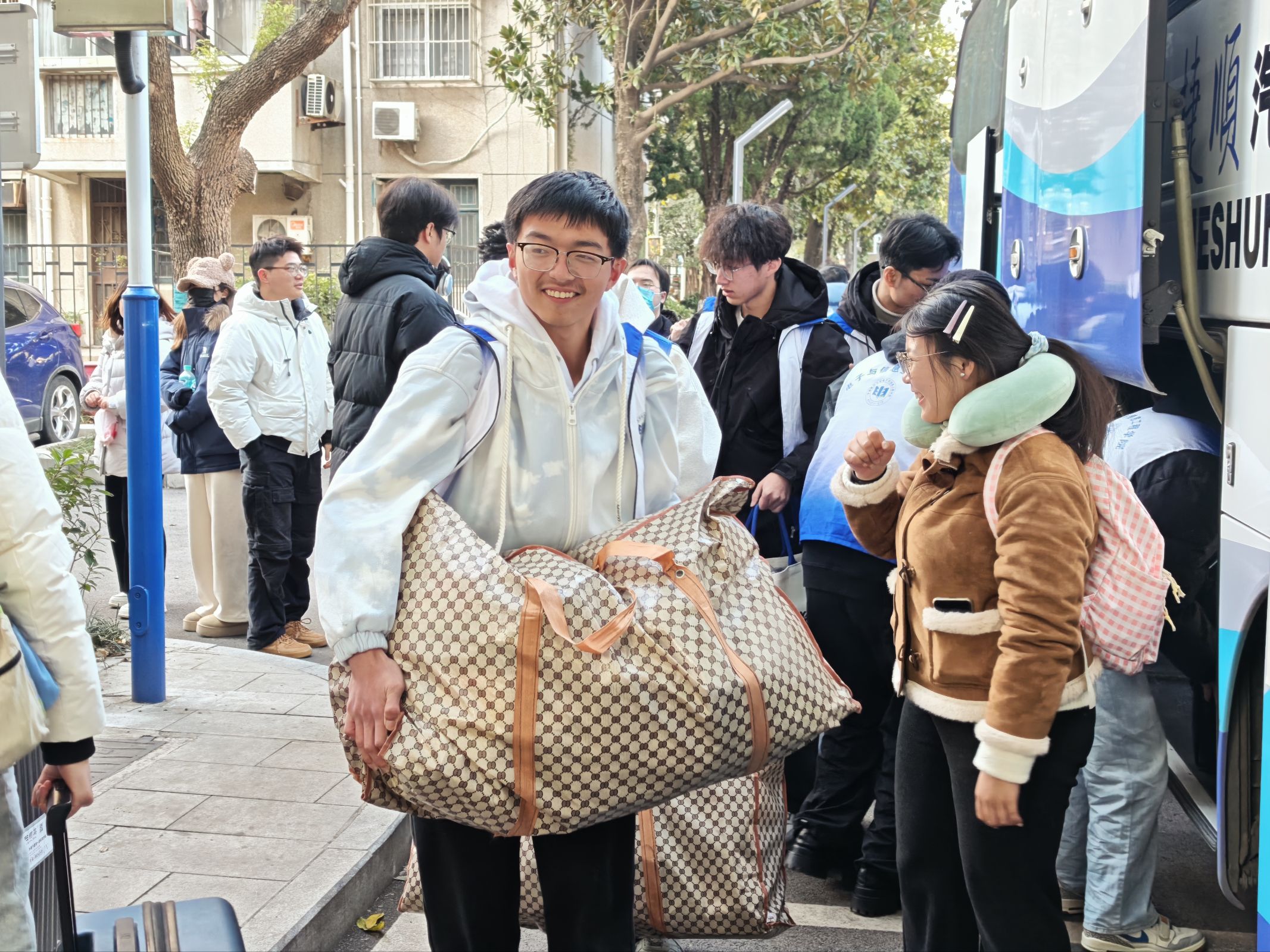 12月26日下午,学院提前组建的学生骨干志愿者服务队已整装待发。志愿者们身着统一服装,早早驻守在校园下车点、宿舍楼下等关键区域,欢迎联培学习返校并帮助同学们搬运行李。从下车点到宿舍楼下,志愿者们忙碌的身影穿梭在校园中,成为冬日里一道暖心风景线。他们用实打实的行动为学子们筑牢“归家第一站”的温暖防线,让同学们刚踏入校园就深切感受到了学院大家庭的浓浓关怀。