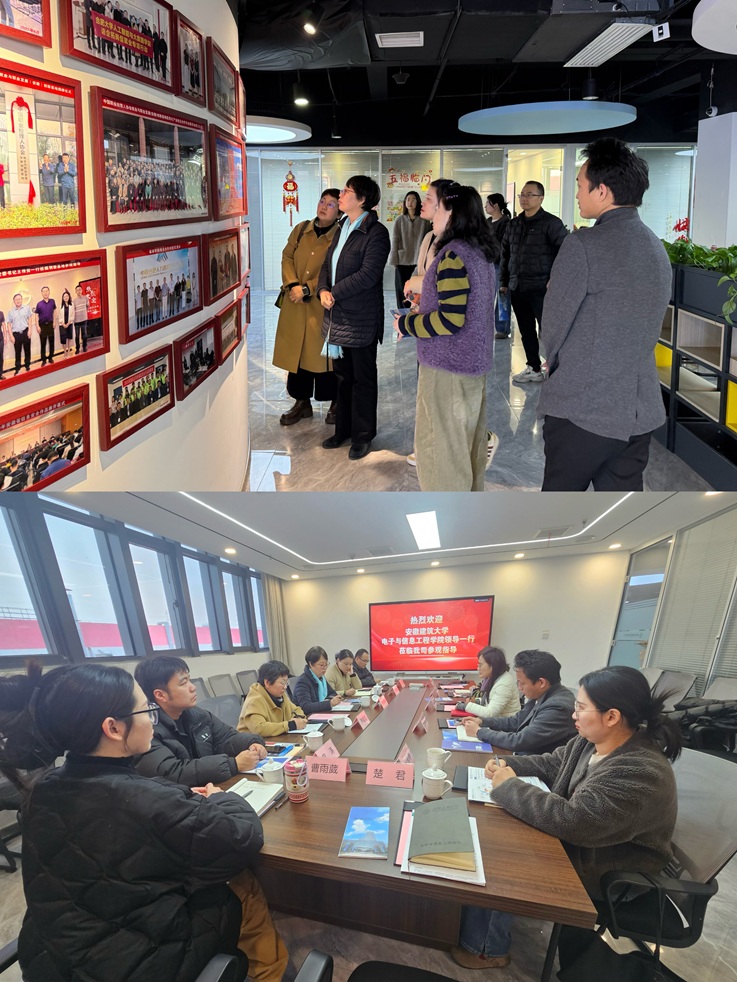 活动伊始,电信学院一行在企业负责人的陪同下,参观了公司展厅及办公环境,详细了解企业的发展历程、业务布局、技术研发及人才需求等情况。公司副总经理李琴介绍,云歌信息致力于匹配企业用人与学校人才培养的需求,为用人单位和毕业生搭建就业平台。他对学院的人才培养质量给予高度评价,并表示期待通过共建实习基地,吸纳更多安建大优秀学子加入,共同服务安徽新一代信息技术产业发展。