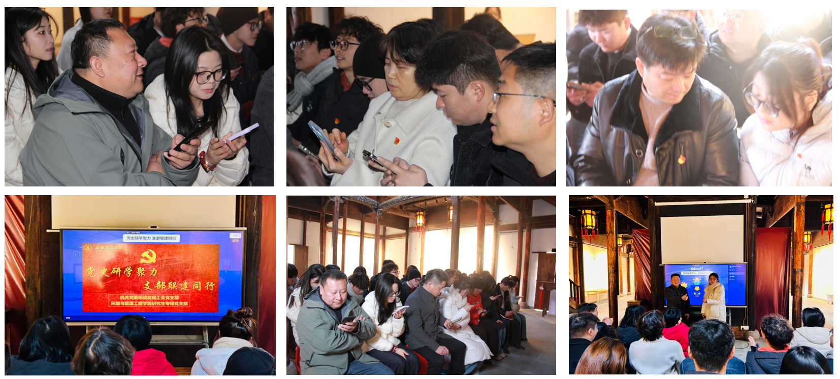 学党史主题活动在学校光启堂正式拉开序幕,共建双方经过前期扎实的师生结对共学,随后开展紧张有趣的党史知识竞赛。党史知识竞赛聚焦中国共产党百年奋斗历程中的重要事件、关键人物与理论成果,依托Kahoot这一数智互动平台创新开展数智化党史知识竞赛。通过生动趣味的数智竞答,竞赛有效激发了党员学习热情,推动学习模式从“被动听讲”向“主动探究”转变。机关党员充分发挥政策解读和实践引领作用,学生党员则展现出扎实的理论素养与活跃的思辨能力,充分彰显了结对共建在提升政治理论学习质效、以党建赋能文化建设方面的显著优势。