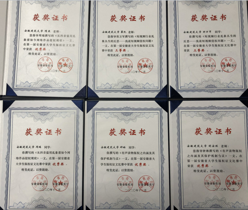 本网讯 近日,由安徽省版权局和安徽省教育厅联合主办的第一届安徽省大学生版权征文比赛,评选结果揭晓。公管学院法学专业学生郑万军获三等奖,钟琳、周瑞获优秀奖,法学系教师翟凯、隋燕、胡安琪获优秀指导教师奖,beat365在线唯一官网获优秀组织奖。