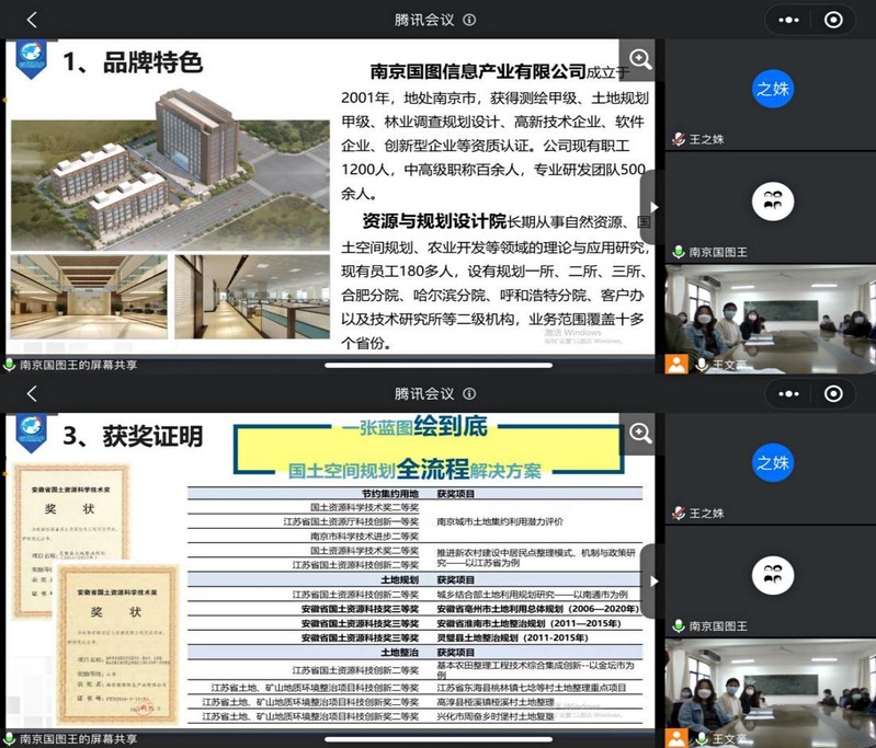 学院在网络平台发布“空中双选会”通告,通过广泛宣传和土管系教师的邀约,中国城市发展研究院、合肥工业大学设计院、合肥润田规划设计有限公司、安徽地源不动产咨询评估有限公司、南京国图信息产业有限公司五家企业单位积极报名参加招聘会。