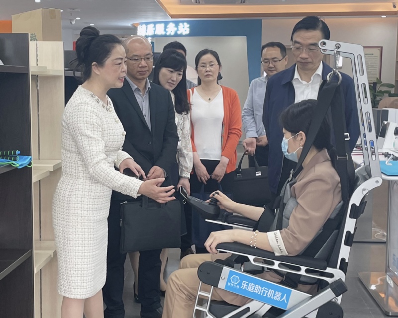 安徽乐庭健康科技产业集团相关负责人陪同孙道胜一行参观“居家+社区 +嵌入式+家庭养护院”一站式智慧养老产业展示区,企业董事长王茂光就企业创新发展、高校人才储备和校企合作、就业渠道拓展等近期规划进行了交流。