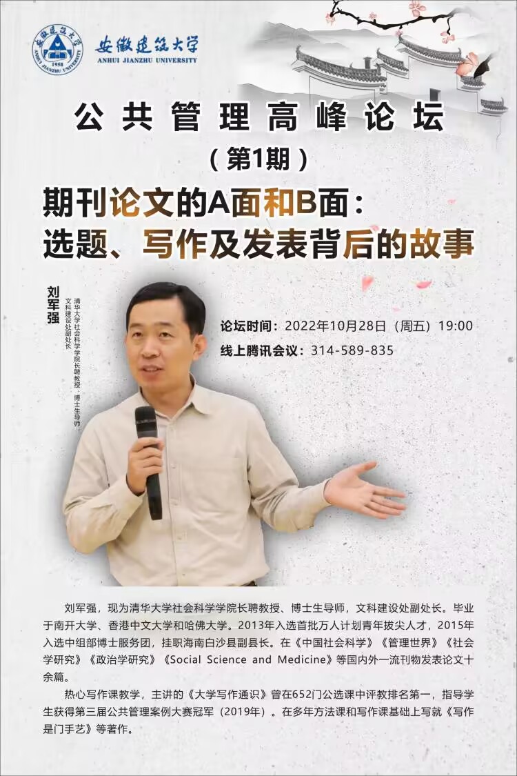 本网讯 为深入推进国家基金申报工作,提升师生科研写作能力,活跃学术氛围,公管学院于10月28日线上举办了公共管理高峰论坛(第1期)。本次论坛邀请了清华大学社会科学学院长聘教授、博士生导师、文科建设处副处长刘军强做题为“期刊论文的A面和B面:选题、写作及发表背后的故事”的学术讲座。学院教师、研究生以及国内各兄弟院校师生200余人参加论坛,论坛由公管学院院长黄佳豪主持。