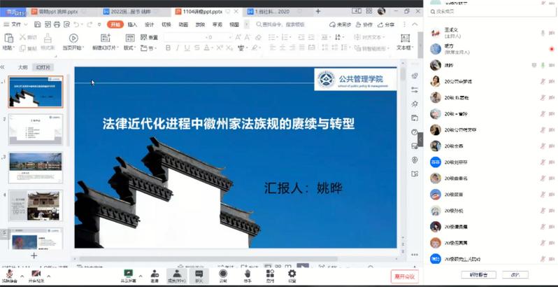 法学专业姚晔博士以国家社科基金申报书《法律近代化进程中徽州家法族规的赓续与转型》为题,从项目的选题依据、研究对象、研究现状及研究价值等方面进行了阐述,并以“徽州家法族规”为切入点,剖视了传统文化法治思想在法律近代化进程中的变迁及对完善中国特色社会主义法律体系的重要现实意义。
