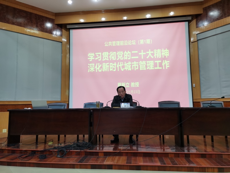 本网讯 为庆祝党的二十大胜利召开,引导广大青年学生深入学习贯彻党的二十大精神,鼓励广大师生在新时代城市管理工作中建功立业,11月23日,公管学院在北校区F楼3楼报告厅举办公共管理前沿论坛第1期暨二十大精神解读报告会,邀请校党委常委、副校长蔡新立教授主讲“学习贯彻党的二十大精神,深化新时代城市管理工作”的学术报告。公管学院院长黄佳豪主持,学院党政领导班子、相关专业系教师及城市管理等专业同学共160余人参加活动。
