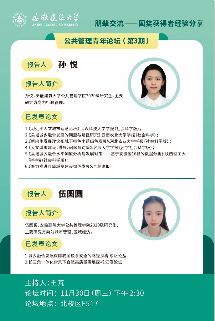 本网讯 为进一步提升研究生的论文写作水平,扎实论文写作基础,激发研究生的写作热情,切实做好研究生的科研工作,11月30日下午,公管学院于北校区F214举办了公共管理青年论坛第3期——朋辈交流:国奖获得者经验分享。论坛邀请了学院本年度国家奖学金获得者孙悦、伍圆圆进行论文写作心得和写作思路的分享。论坛由研究生辅导员王芃主持,公管学院2021级、2022级研究生参加。