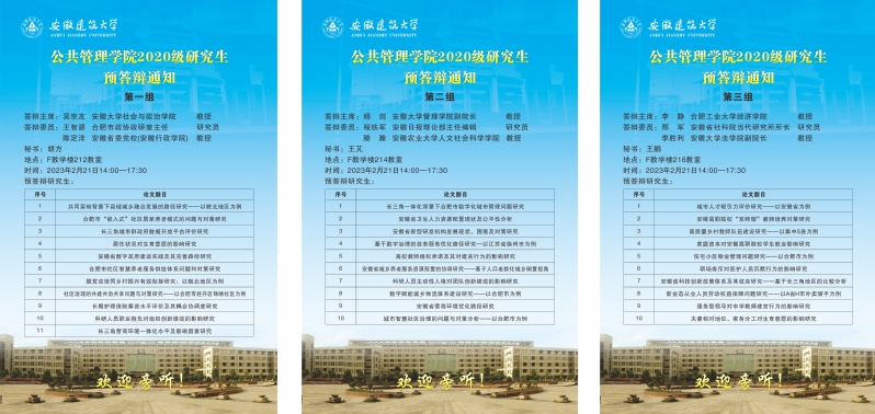 本网讯 为落实立德树人根本任务,提高硕士研究生学位论文质量,确保2023届硕士研究生顺利毕业,公管学院于2月21日进行了2023届硕士研究生学位论文预答辩。本次预答辩采取“学生、导师”双匿名方式,邀请了合肥工业大学、安徽大学、安徽农业大学、安徽省社科院、省委党校(安徽行政学院)、安徽日报、合肥市政协政策研究室等9位专家担任预答辩评委。共有31名硕士研究生参加预答辩,2021级、2022级研究生旁听学习。