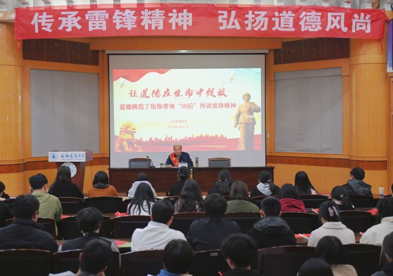 本网讯 为代代传承雷锋精神,将对党忠诚、服务人民意识融入日常、化作经常,引导青年学习好思想、好作风、好品德,3月21日,公共管理学院邀请全国科技助力扶贫 “先进工作者”、安徽省道德模范丁伦保走进beat365在线唯一官网,给“00后”传讲雷锋精神,让道德在生命中绽放。学院党委副书记马晓艳主持报告会。
