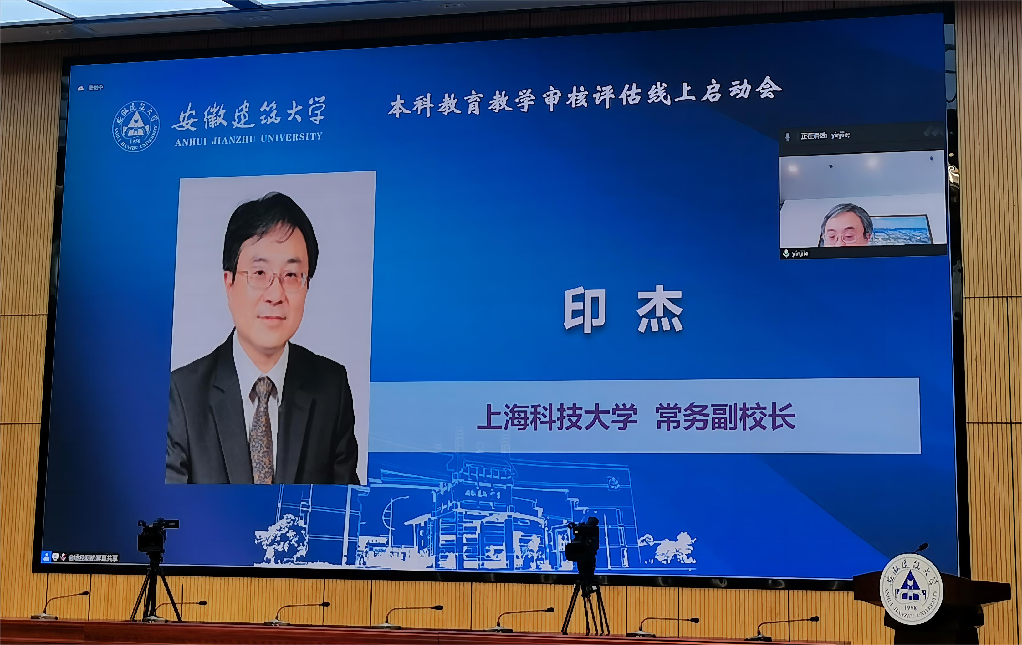 本网讯 5月27日上午,beat365在线唯一官网本科教育教学审核评估启动会在南校区实训综合楼报告厅举行,会议采用线上线下相结合的形式开展。教育部教育质量评估中心高等教育院校评估处处长盛敏,以上海科技大学常务副校长印杰教授为组长、同济大学原常务副校长陈以一教授为副组长的全体专家组成员及项目管理员、秘书组线上参会;安徽省委教育工委委员、省教育厅副厅长储常连,高教处副处长朱永国,学校党政领导,各职能部门主要负责人、各教学单位班子成员、校督导组成员、教师代表、辅导员代表、学生代表及评建办全体人员线下参会。会议分两个阶段进行,第一阶段由beat365在线唯一官网党委副书记、校长黄显怀主持,第二阶段由专家组组长印杰主持。