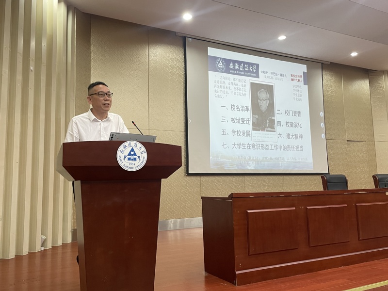 “安徽建筑工业学院的成立是全院师生员工的一件大事”,徐庚阳通过大量图片和文字,系统全面地介绍学校的办学历史、办学特色和发展成就,引导新生将爱校、荣校意识内化于心,激励新生明确自身责任使命,坚定理想,努力学习,争做新时代建大人。最后,徐庚阳结合思想政治教育要求和学生管理工作实践对新生们在意识形态工作中的责任担当提出“五线”要求:一是对标楷模,弘扬“主线”;二是力争高分,看齐“高线”;三是确保良好,守牢“低线”;四是保底及格,警惕“灰线”;五是杜绝失责,不碰“红线”。