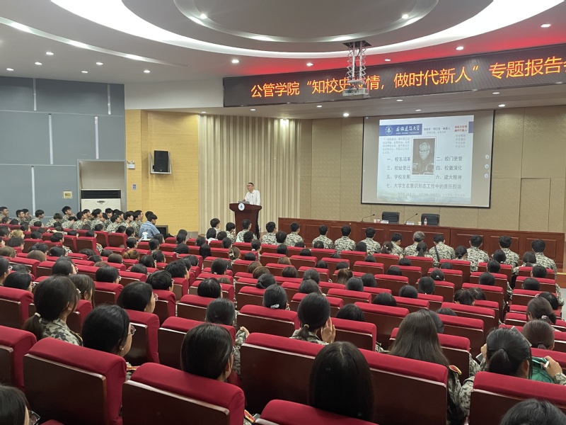 学校的历史是新生入学教育最生动、最有说服力的教科书。公管学院把校史校情教育作为新生入学教育切入点,9月26日,邀请校党委常委、宣传部部长徐庚阳以《学校史校情,做时代新人》为题作主题报告,从校名沿革、校门更替、校址变迁、校徽演化、学校发展和建大精神等方面进行讲解,开展校史校情教育。