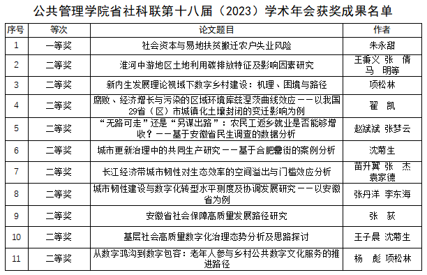本网讯 近日,安徽省社科联公布了第十八届(2023)学术年会获奖成果名单,公管学院共获奖11项,其中一等奖1项,二等奖10项,占全省获奖总数的7.3%,是全省获奖总数最多的二级学院。