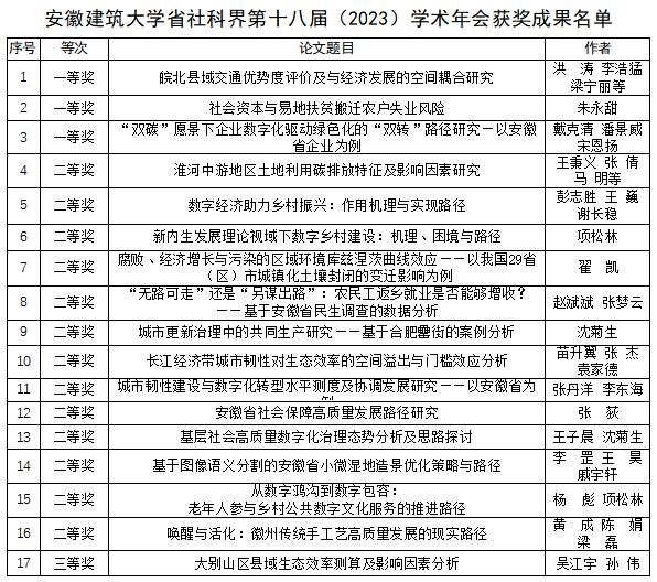 本网讯 丹桂飘香秋意浓,金秋时节硕果丰。近日,安徽省社科联公布了第十八届(2023)学术年会获奖成果名单,学校获奖17项,占全省获奖总数的11.3%,一等奖3项、二等奖13项、三等奖1项。其中,公管学院共获一等奖、二等奖11项。