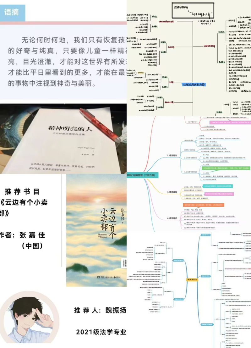 微书评活动以新颖的“微”概念+书评的方式展开,受到了同学们的广泛关注和热情参与。活动经过投稿遴选,通过“安建大公小管”公众号展示学生们对阅读满腔热情的书评,让广大师生感受书籍的魅力,实现以书怡情、以书启智、以书育人的教育目标思维导图绘制大赛采用线上线下结合的方式开展,公收到学生56份作品。比赛通过两轮筛选,评选五位一等奖作品,观其思维导图,学科内容详略得当,布局巧妙别致思维导图大赛的开展不仅助于同学们将隐性知识显性化,将言语信息图像化,还能够帮助同学们系统地构建完整有效的知识网络系统改进学习方法,提高学习效率。