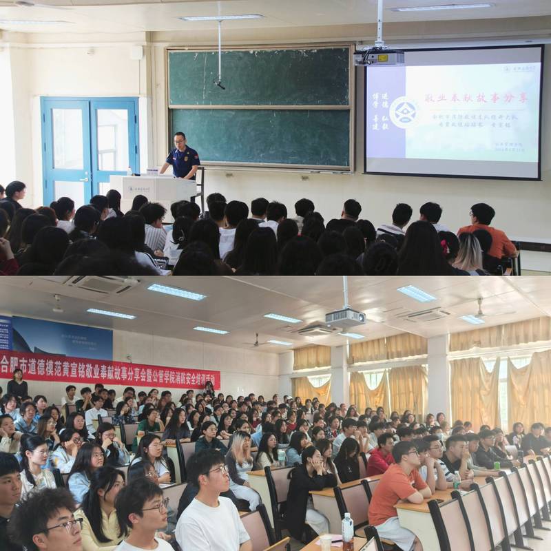 本网讯 为贯彻落实总体国家安全观,进一步加强校园消防安全教育,提高师生员工防灾减灾安全意识,增强防灾减灾应对和逃生本领,近日,公管学院开展敬业故事分享会暨消防安全演练活动。活动特别邀请合肥市道德模范、合肥市岗位学雷锋标兵、合肥消防支队经开大队丹霞站站长黄宣铭开展宣讲,学院各年级学生与辅导员共300余人参加活动。活动得到合肥市消防支队包河大队宿松路消防救援站和校保卫处、后勤管理处大力支持。
