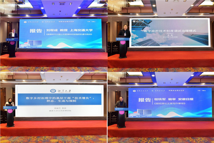 主题报告环节,全国公共管理专业硕士学位教育指导委员会委员、上海交通大学国际与公共事务学院副院长刘帮成教授,全国公共管理专业硕士学位教育指导委员会委员、南京大学政府管理学院李鹏教授,湖南省行政管理学会副会长、湘潭大学梁丽芝教授,安徽日报理论部副主任、编审程铁军分别作了《数智时代中国公共管理知识创造的机遇与挑战》《数字政府的技术制度双向调试治理》《数字乡村治理中的基层干部“技术增负”:样态、生成与规制》《报纸理论文章写作要领》的专题报告。