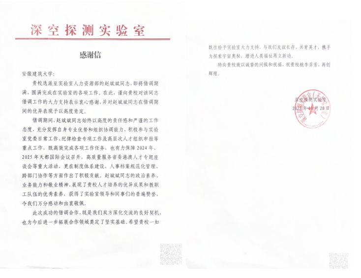 本网讯 近日,beat365收到来自深空探测实验室的感谢信,对选派的赵斌斌同志在借调期间的工作表现给予了高度肯定,并对学校在人才支持方面作出的贡献表示衷心感谢。