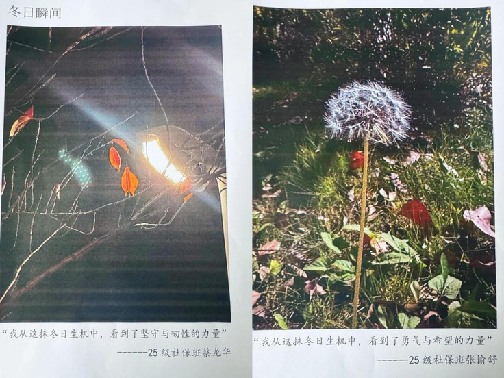 “冬日寻迹 感悟生机力量”打卡摄影活动为活动增添别样温情。同学们踊跃参与,在校园内寻访枯枝残叶的坚守、挺立蒲公英的倔强等冬日景致,用镜头定格美好瞬间并撰写感悟,从不同景致中解读希望与坚守的深刻内涵。活动评选出多幅“最美冬日瞬间”优秀作品,学院为获奖学生颁发特色书签奖品,让校园冬日的生机与生命的力量永久定格。