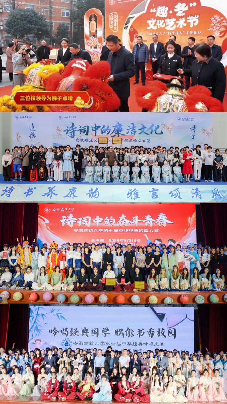 文化活动推陈出新焕生机。紧紧围绕学生成长需求,用心关照学生发展诉求,全力服务学生全面成才,多措并举营造积极向上、格调高雅的校园文化氛围。深耕文化育人阵地,打造了一批具有思想深度、文化厚度和青春热度的品牌活动。其中,中华经典吟唱大赛以古韵新声的形式,让千年经典在朗朗传唱中焕发时代活力;国学文化节通过名家讲座、非遗体验、经典诵读等多元环节,为学子搭建起亲近中华优秀传统文化的平台;·冬文化艺术节以冬为媒、以文为桥,将中华优秀传统文化与建大校园文化深度融合,让学生在非遗体验中感悟传统文化魅力,在文体活动中汇聚蓬勃青春力量,在科艺交融中激活无限创新潜能。这些特色鲜明的文化活动凭借高质量的内容与广泛的参与度,先后被“学习强国”学习平台、合肥新闻联播等主流媒体关注报道,不仅展现了学院文化建设的丰硕成果,更扩大了校园文化的辐射力与影响力。