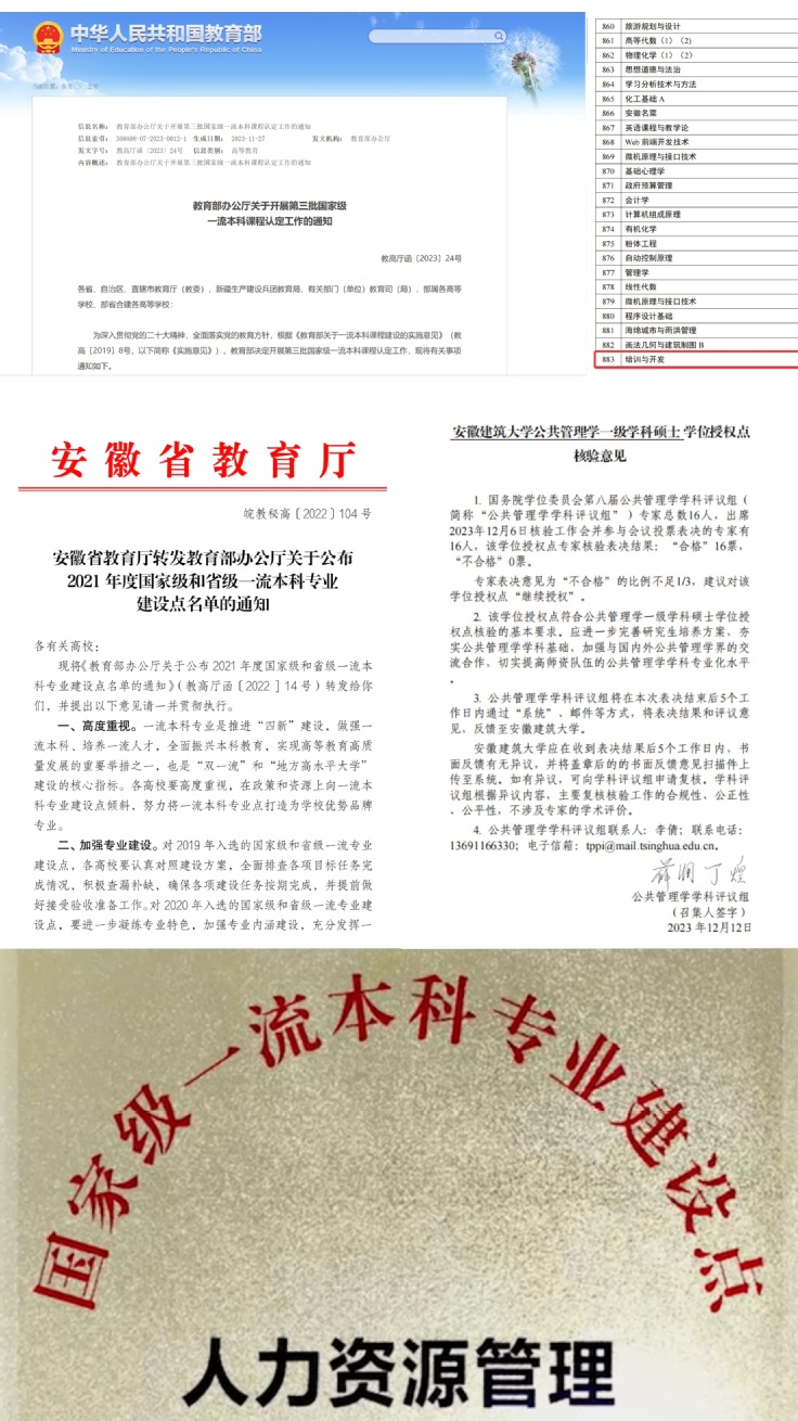 教学质量笃行实干结硕果。“十四五”期间,教师教学竞赛成绩突出,获全国教师教学创新大赛二等奖1项、三等奖1项,安徽省教师教学创新大赛一等奖5项、安徽省高校青年教师教学竞赛一等奖2项,其他省级或校级教学竞赛获奖30余项,教师教育教学能力普遍显著提升。累计获批国家级一流课程1门,省级一流课程3门,在高等教育出版社等出版教材10部,在SSCI等重要期刊发表教研论文39篇,课程建设、教材建设与教学研究成效显著。获教育部产学合作协同育人项目立项累计12项,省级质量工程立项数量累计32项,中国建设教育协会课题累计立项12项,教学质量工程项目建设量质齐升。此外,国家级新文科研究与实践项目推荐出校1项。