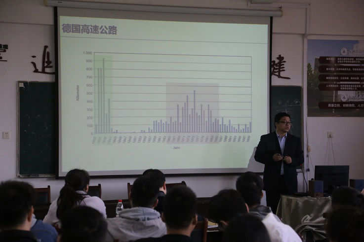 王大为教授在土木学院三楼会议室做了以“德国智能地毯式铺装路面”为主题的学术报告,报告会由土木工程学院院长吴德义主持,道桥系多位专业任职教师与研究生、本科生听取了报告。王大为教授立足国际角度,为beat365师生介绍了德国智能地毯式铺装路面的发展。地毯式铺装是柔性可卷曲的预制道路面层,能显著提高抗滑性质和路面排水能力、降噪、降解尾气、能量采集和存储等。地毯式铺装还可作为智能路面的一个载体,实现了交通数据的采集,进而为未来人-车-路的交互、交通流的控制和疏导奠定基础。