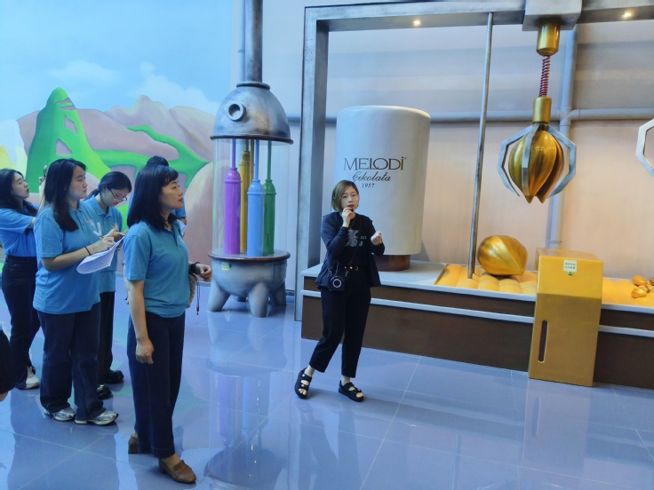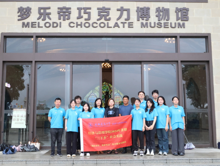 在五里桥村,实践团前往鹏翔梦乐帝巧克力玫瑰小镇,在工作人员的带领下进行观摩学习。在巧克力博物馆,实践团通过近距离观看巧克力工艺品制作过程,深入了解巧克力的发展历史和小镇文旅产业的发展情况。在小镇内,同学们参观特色农产品种植采摘、水产养殖、家禽家畜养殖、研学拓展、农事体验、航空航天科技馆等场所。