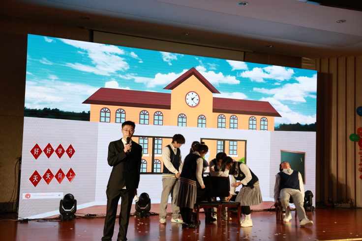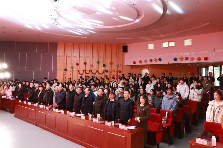 现场氛围热烈且喜庆,文艺展演高潮不断,掌声与欢呼声接连响起。随着《桃花朵朵开》歌声响起,展演激情收官,全体师生一同合影留念。