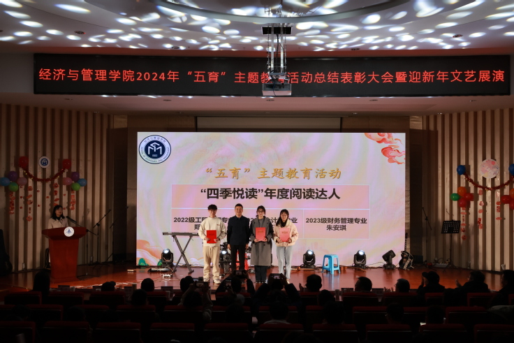 本网讯 为贯彻立德树人的根本任务,持续深入推进“五育融合”的育人模式,营造高品质的校园文化环境。12月31日,经管学院在金寨路校区图书馆报告厅举办“五育”主题教育活动总结表彰大会暨迎新年文艺展演。学校相关部门领导、学院领导班子、教师代表、校友代表亲临现场,与250余名学生代表一同共享盛会。此外,1500多名在校生和各届校友通过学院官方抖音号观看了活动直播。