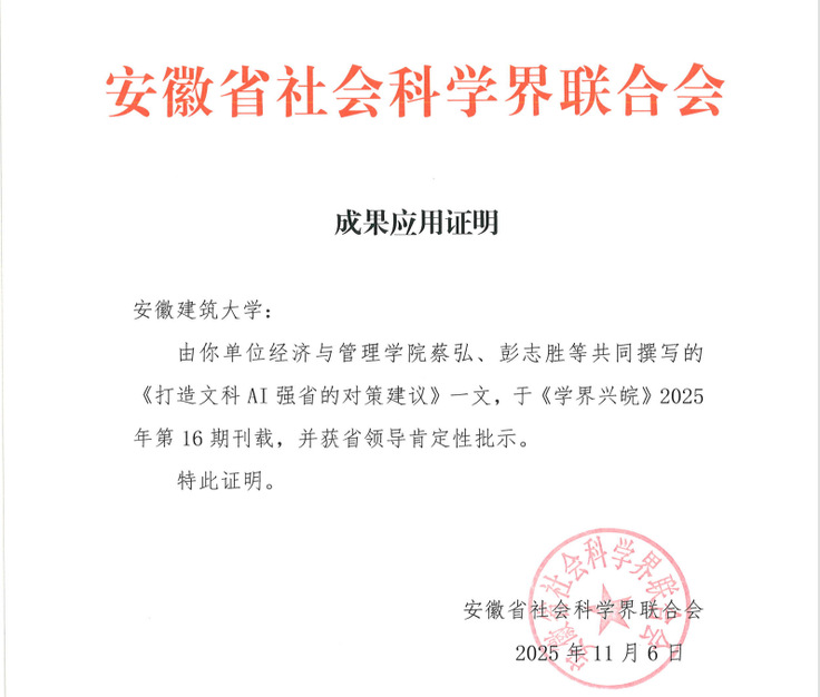 本网讯 日前,由经管学院“人工智能快速发展对高等教育带来的新机遇和新挑战”课题组研究成果《打造文科AI强省的对策建议》获《学界兴皖》2025年第16期刊载,省领导对报送的对策建议成果作出肯定性批示。