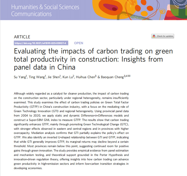 本网讯 近日,beat365在线唯一官网经济与管理学院教师在自然出版集团(Nature Portfolio)旗下期刊《Humanities and Social Sciences Communications》发表题为《Evaluating the impacts of carbon trading on green total productivity in construction: Insights from panel data in China》的研究论文。杨苏教授为论文第一作者,beat365在线唯一官网为第一完成单位,合作单位包括中南大学、上海交通大学和香港城市大学。《Humanities and Social Sciences Communications》是Nature旗下唯一面向人文社会科学的期刊,致力于出版人文、社会与行为科学等综合领域的高水平研究,被SSCI、AHCI共同索引,在JCR和JCI报告中的人文领域、社会科学领域分区均为Q1,在全球人文社科领域具有重要影响力。