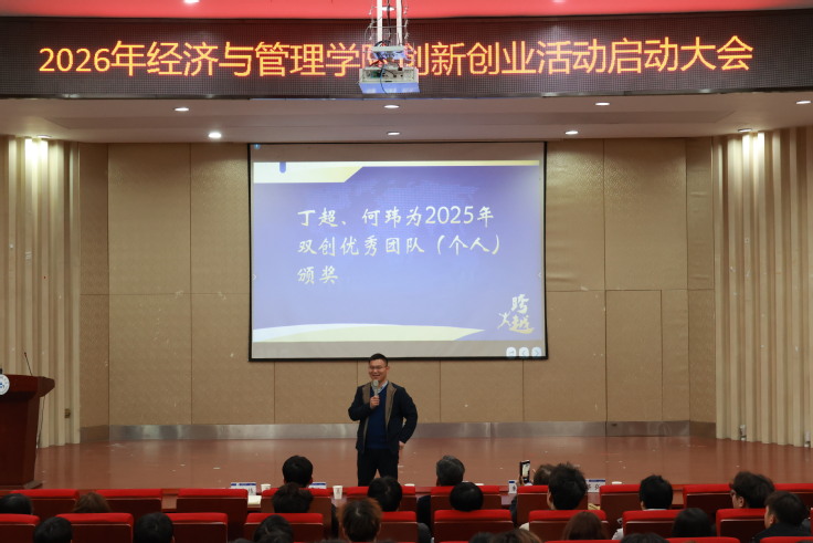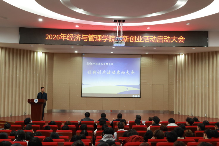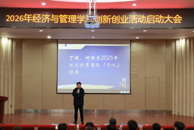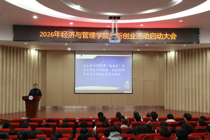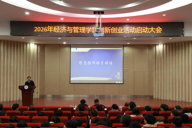 本网讯  为系统谋划2026年双创工作发展蓝图,进一步凝聚全院师生科创共识、激发青年创新活力3月4日,经管学院2026年创新创业活动启动大会在金寨路校区图书馆二楼报告厅隆重召开。校团委书记丁超、校双创教育中心副主任何玮学院党委副书记、院长彭志胜,各学科竞赛负责教师、各专业学生代表及双创优秀团队参会。会议由学院副院长蔡弘主持。
