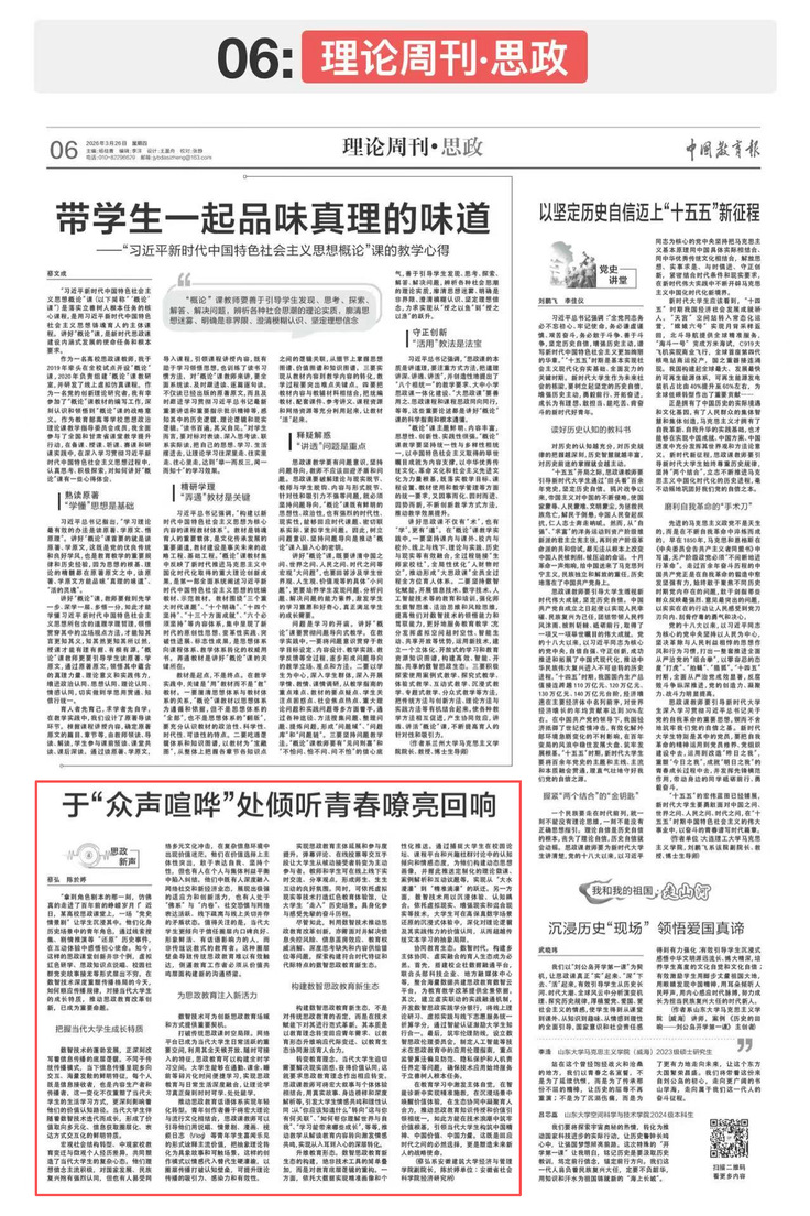 本网讯 3月26日,我院青年教师蔡弘的理论文章《于“众声喧哗”处倾听青春嘹亮回响》在《中国教育报》理论周刊思政专版发表。文章紧扣时代脉搏,深刻分析了在自媒体蓬勃发展背景下,当代大学生在信息获取、价值观念等方面呈现的鲜明特质,思考了网络空间正悄然重构价值引领的青春对话新形态。