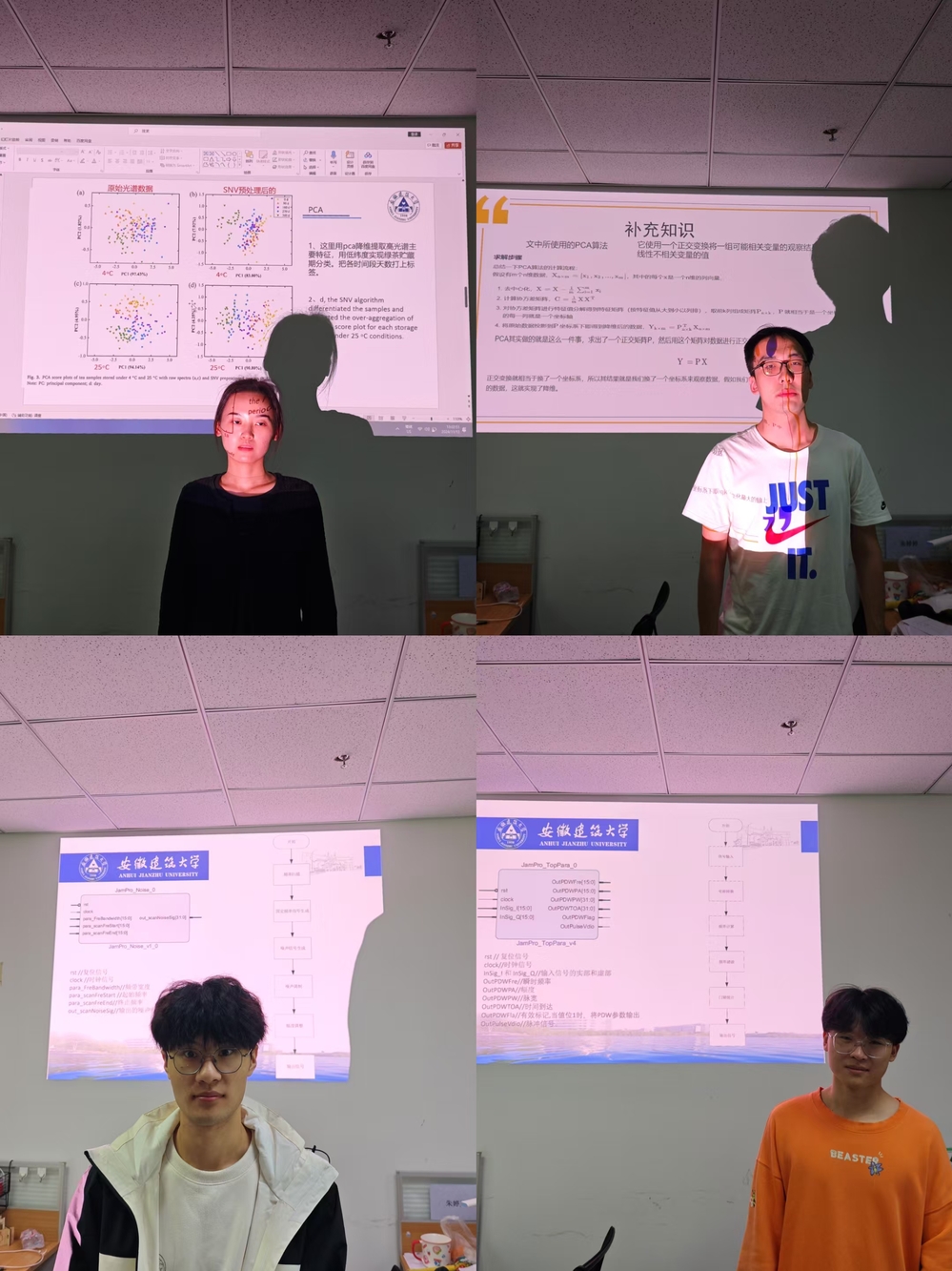 在研讨中,张哲健同学从理论基础到实践应用,详细讲解了如何利用Zynq和AD9361芯片对信号进行干扰。通过多层次的剖析,他展示了如何将芯片资源有效整合并应用于实际场景,突出解决复杂信号干扰问题的策略。王晓慧同学的报告聚焦于绿茶贮藏品质的高光谱图像监测。她系统介绍了不同贮藏条件下,绿茶品质变化的光谱响应特性,借助丰富的实验数据和分析方法,她展现了高光谱成像技术在食品质量检测领域的广泛应用前景。