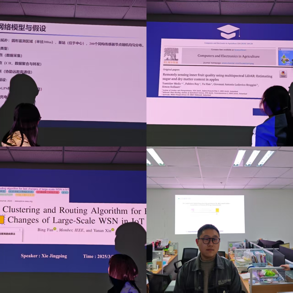 王曼曼同学首先带来了以“基于高光谱激光雷达的水果糖分与干物质含量估算”为主题,分享了她在精准农业方向的最新思考。张梦莉同学就“点云分割方法的最新研究进展”展开了深入分析,涵盖了传统算法与深度学习技术的融合实践。解静平同学以“无线路由路径优化”的报告,从网络通信效率、路由算法改进等角度,阐述了无线网络在复杂环境下的智能路径选择问题。郭俊良同学则介绍了一种“由神经网络构建的室内定位方法”,他详尽解析了深度学习在空间定位任务中的应用潜力。