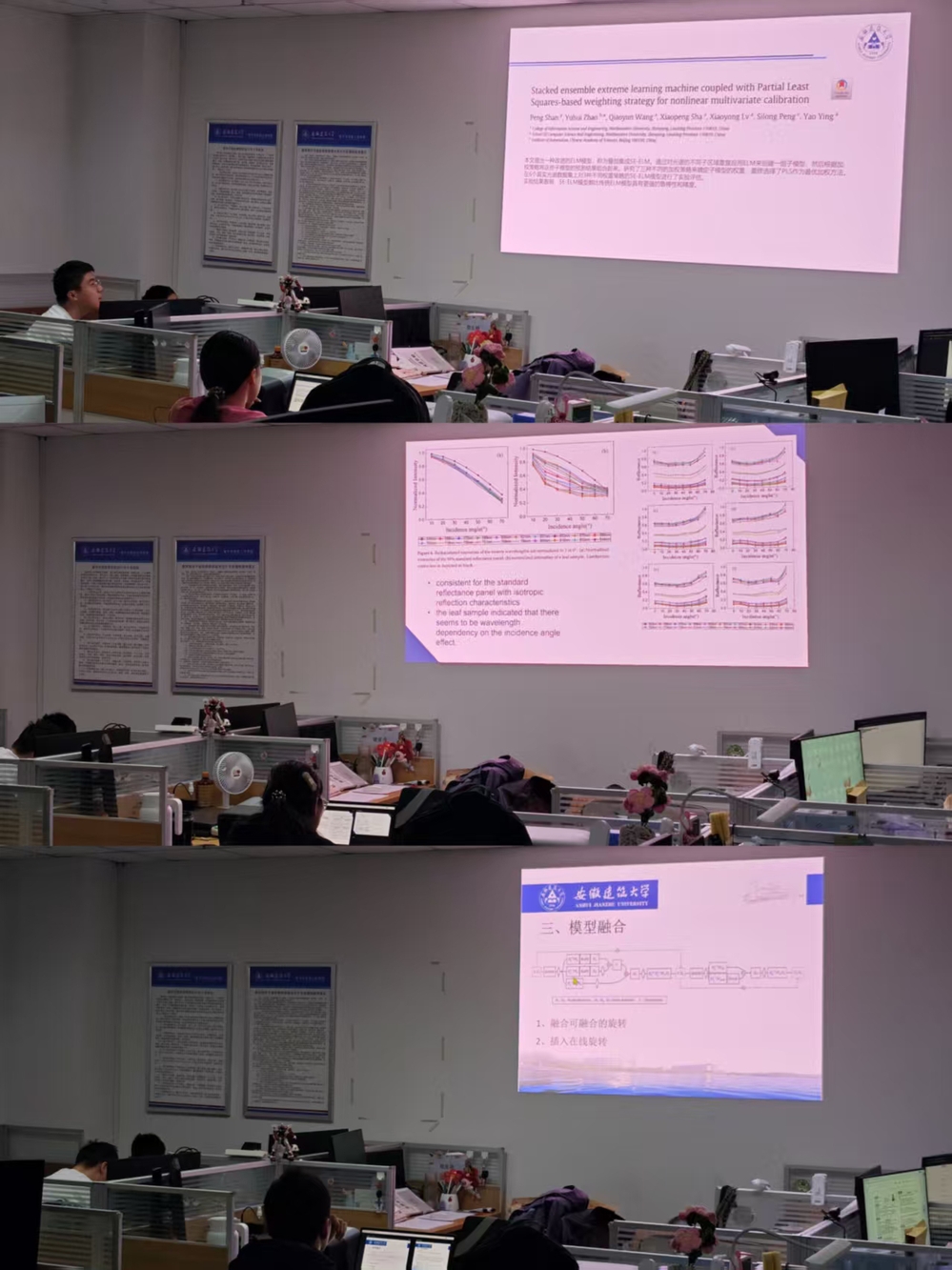 会上,王晓慧同学介绍了堆叠集成ELM结合PLS加权的非线性多变量定标框架。该方法以PLS为层间权重以提升光谱建模的稳定性与泛化能力,相较单模型与常规集成在多组近红外数据上取得更低预测误差,展现出良好的工程可迁移性。