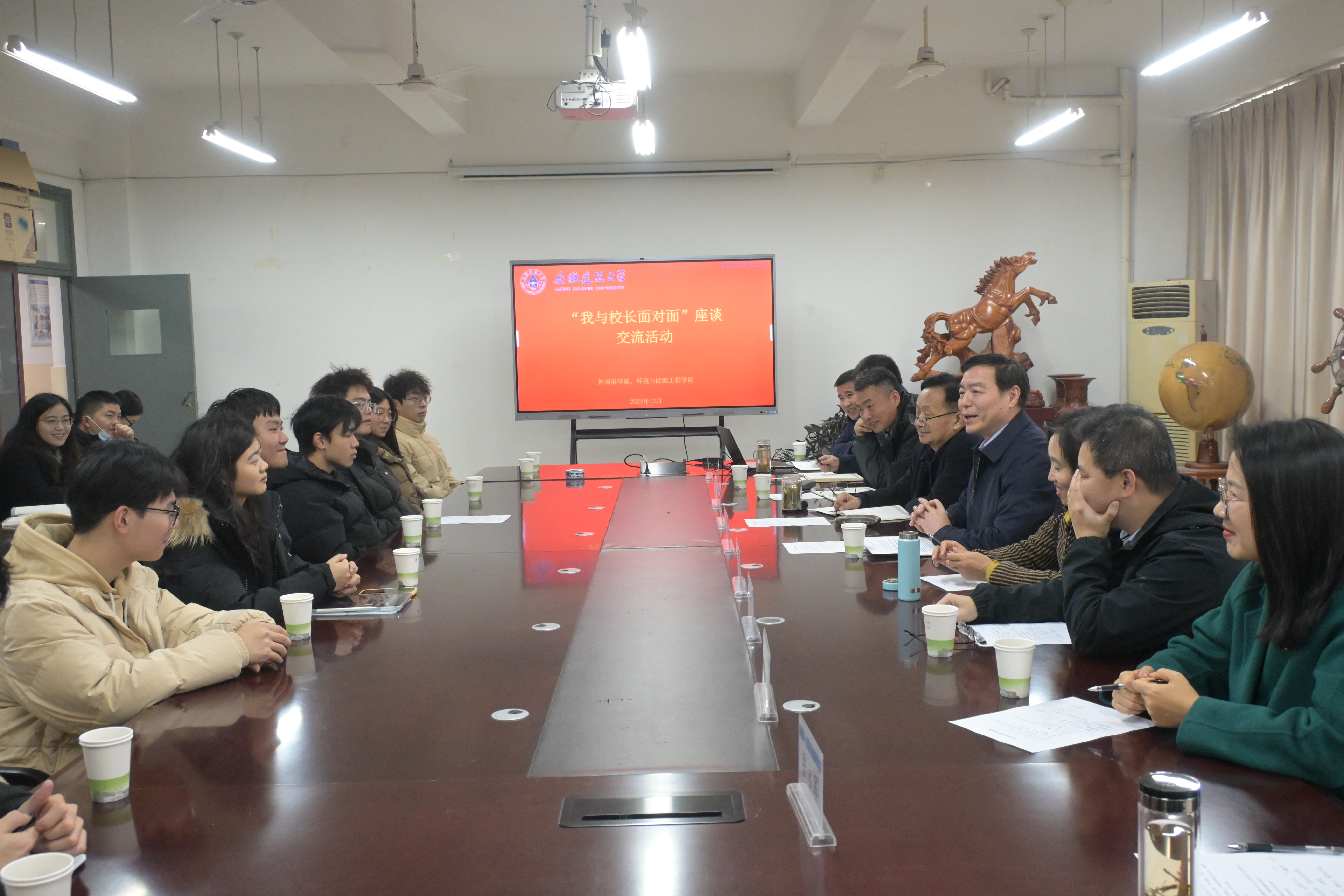 12月4日,在徽文楼212会议室,黄显怀与环能学院、外国语学院师生们亲切座谈交流。他深情地回忆起往昔的求学岁月,分享宝贵经验和人生感悟,座谈会现场氛围温馨而热烈。学生们也畅所欲言,从自身生活、规划、课程优化、学校发展等方面分享体会与困惑,黄显怀耐心倾听学生心声,就学校未来规划、院系设置、专业建设、校园文化、基础设施建设等方面的意见建议给予回复,座谈会上,英语俱乐部、环境保护协会等社团负责人向校长汇报了社团建设情况,并就存在问题进行了求助,黄校长对社团建设取得的成绩表示赞许,对社团的进步发展做了要求,对同学们的求助进行了积极回应,同时鼓励同学们珍惜韶华、不负青春,勇担新时代大学生的使命、责任和担当。