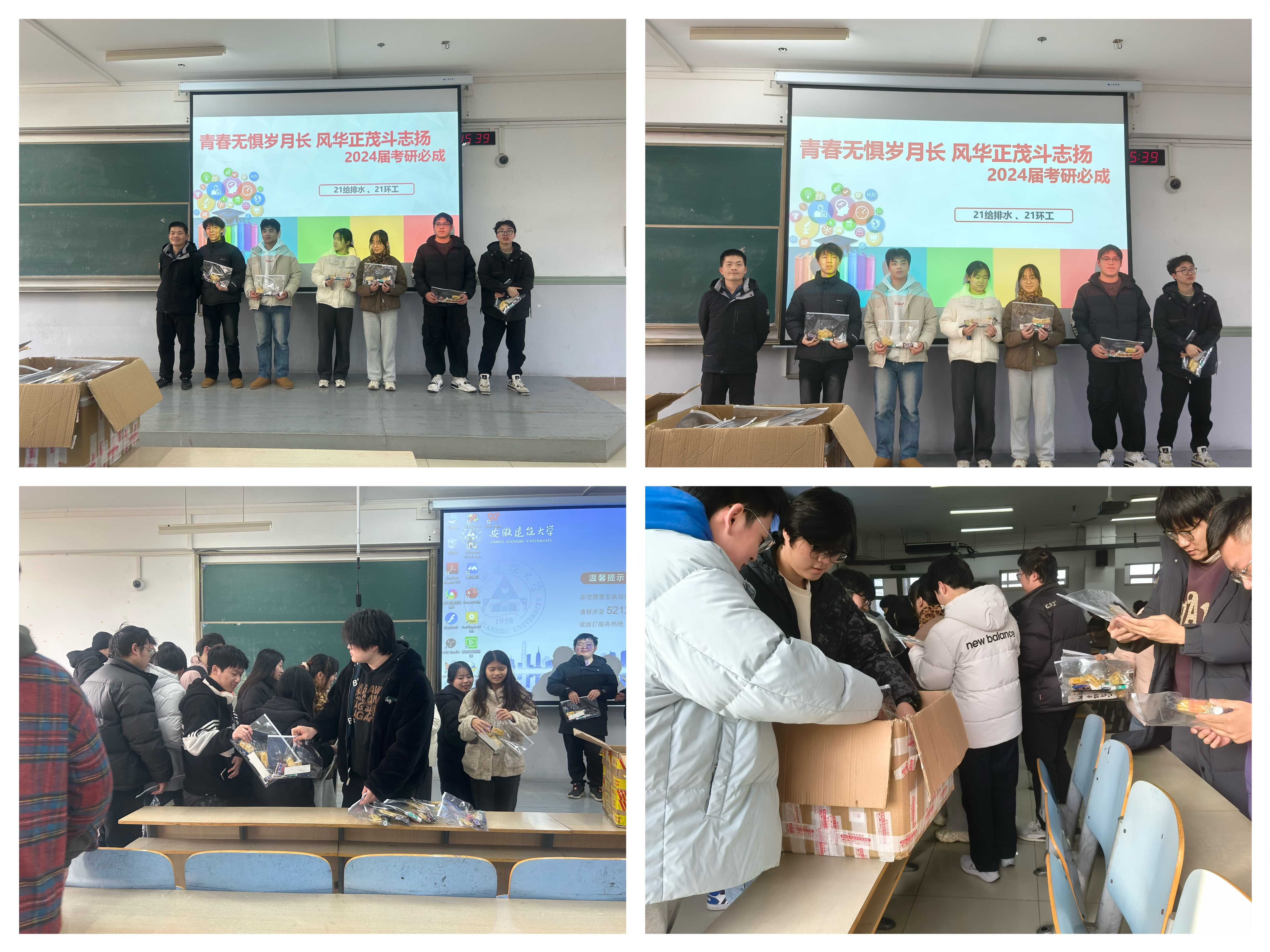 环能学院师生为每一考生都精心准备了暖心礼包,礼包中除了有象征“具”佳表现的文具礼包外,还有“士”必能行的士力架、神来气“旺”的旺旺仙贝等能量补充食品,蕴含着对考研学子的衷心祝愿。毕业班辅导员还为考研学子准备了“出征”仪式,学生接过暖心礼包后备受感动,表示一定会以斗志昂扬精神状态,发挥出最佳水平以回报老师的关心和学院的期待。老师们用幽默的话语缓解同学们的压力,让他们轻装上阵,同时,鼓励同学们坚定考研信心,并嘱咐考研注意事项与准备,做到“不疏忽,无纰漏”。