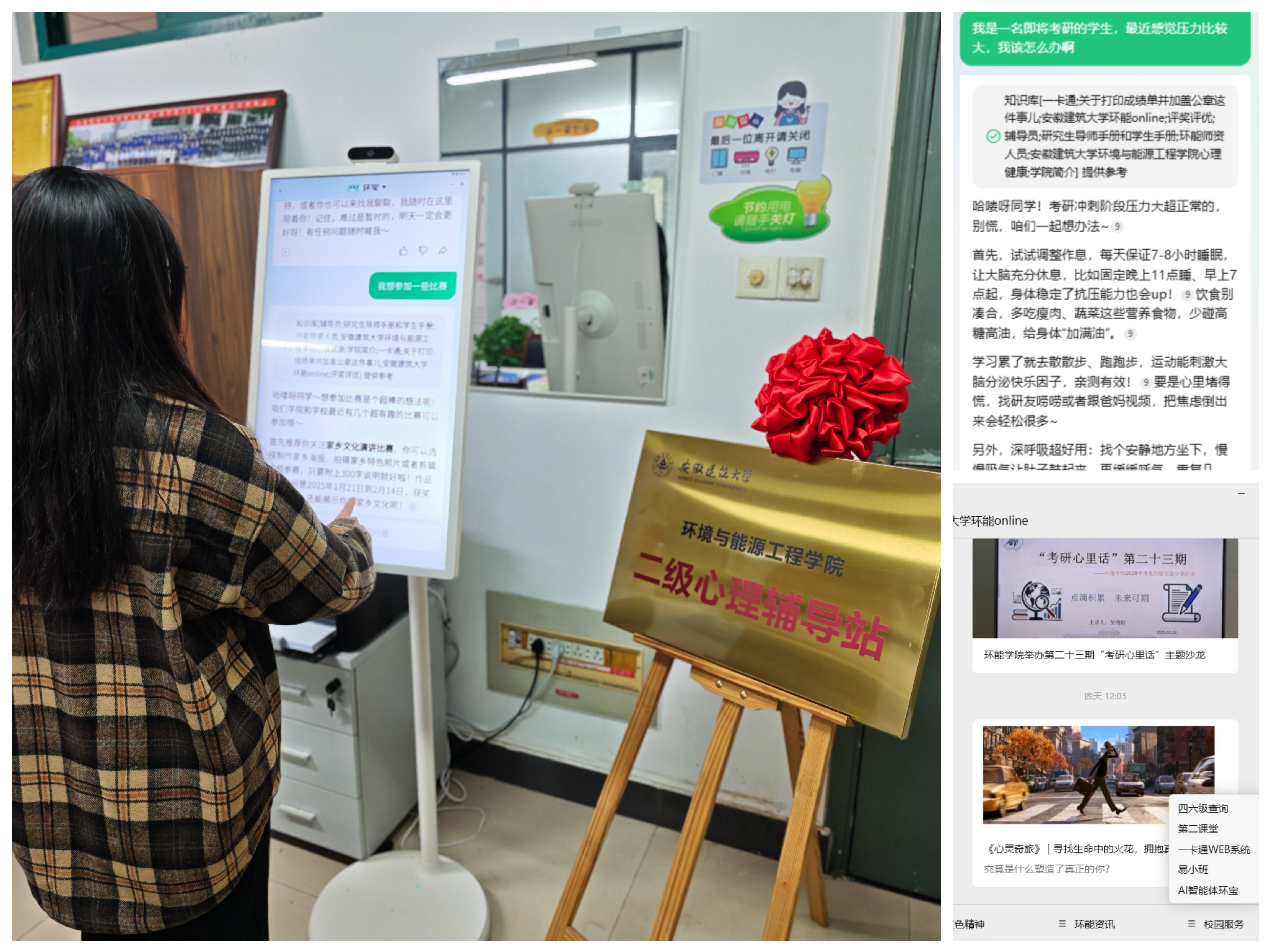 辅导站还引入了AI智能体“环宝”,这一创新举措极大地提升了心理服务的效率与质量。“环宝”依托学院专业特色,通过接入学校规范性文件与环能“资讯”,能够为学生实现7×24小时咨询服务和提供个性化的心理辅助与支持。创新融合GraphRAG知识图谱与情感计算技术,使“环宝”具备情感共情能力,真正实现“智能”与“温度”的有机统一。无论是学习压力、人际关系还是职业规划,“环宝”都能以智能、便捷的方式给予解答与引导,成为师生们贴心的心理助手。目前,“环宝”已完成千余人次咨询,在学院日常学生工作中发挥重要作用,有效促进了师生之间的沟通与交流。