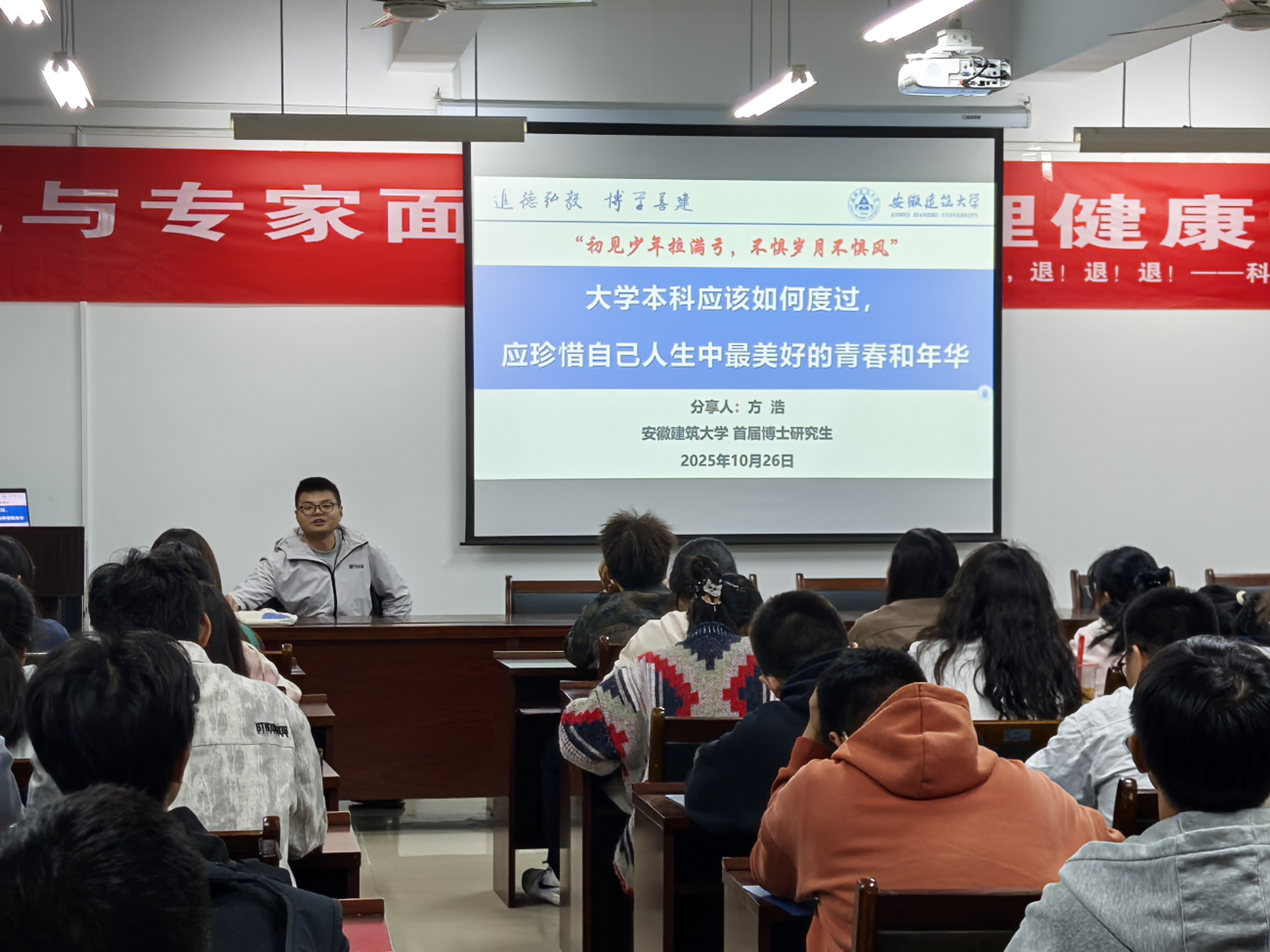 方浩讲述的内容为“大学本科应该如何度过,应珍惜人生中最美好的青春与年华”。作为beat365在线唯一官网的首届博士研究生,方博士以自己从本科到博士的成长经历为大家做了分享。他强调,大学不仅仅是学习专业知识的地方,更是个人成长和自我塑造的关键时期。方浩博士分享了自己在大学期间如何正确规划时间、如何利用资源开展学科竞赛,提升自我的经历,鼓励同学们珍惜青春,保持积极心态,享受大学生活的多彩面。最后为2025级新生寄语:“大学四年是人生中最宝贵的时光,要学会规划,平衡好学业与个人成长,努力成为全面发展的专业人才,珍惜每一天,迈向更加辉煌的未来。”