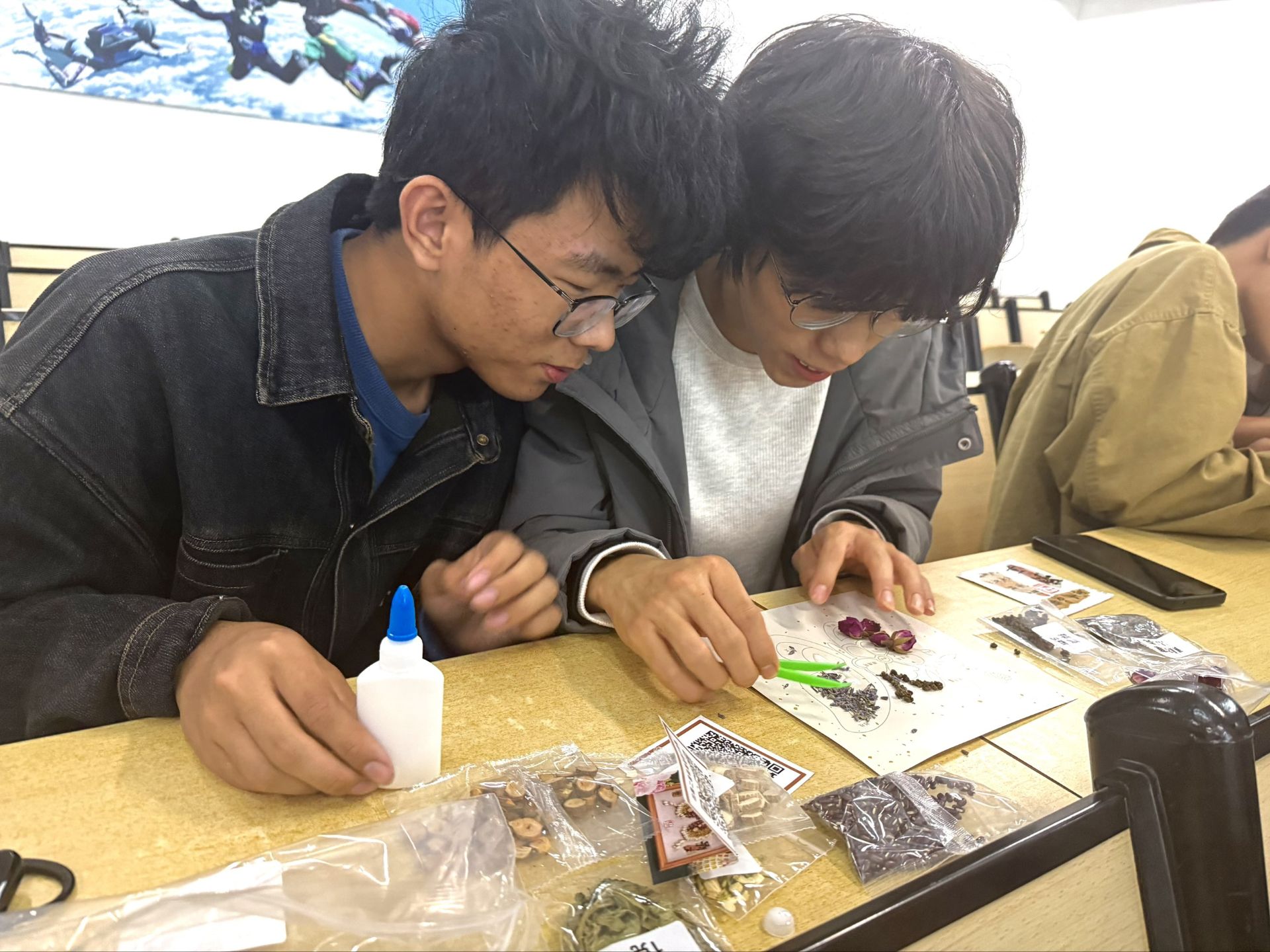 巧手创佳作,劳动凝真情在温馨有序的氛围中,传统文化手工创作环节正式开启。同学们分组协作,沉浸式体验两项特色劳动实践:一是制作非遗风格杯垫,以彩绳、布料等常见材料为基础,通过编、织、缝等传统技法,将创意与匠心融入每一个针脚,让普通材料在指尖绽放独特光彩;二是创作“五谷丰登”节气画,运用红豆、绿豆、小米等谷物,精心排布出象征冬日丰饶、国泰民安的图案,既还原了农耕文化的质朴智慧,也传递了对美好生活的期许。创作过程中,同学们相互请教、分工协作,在穿绳引线、排版粘贴的劳动中,感受传统手工艺的精妙,体会劳动带来的成就感与归属感。每一件作品都凝聚着新生们的巧思与汗水,成为立冬时节最珍贵的文化信物。