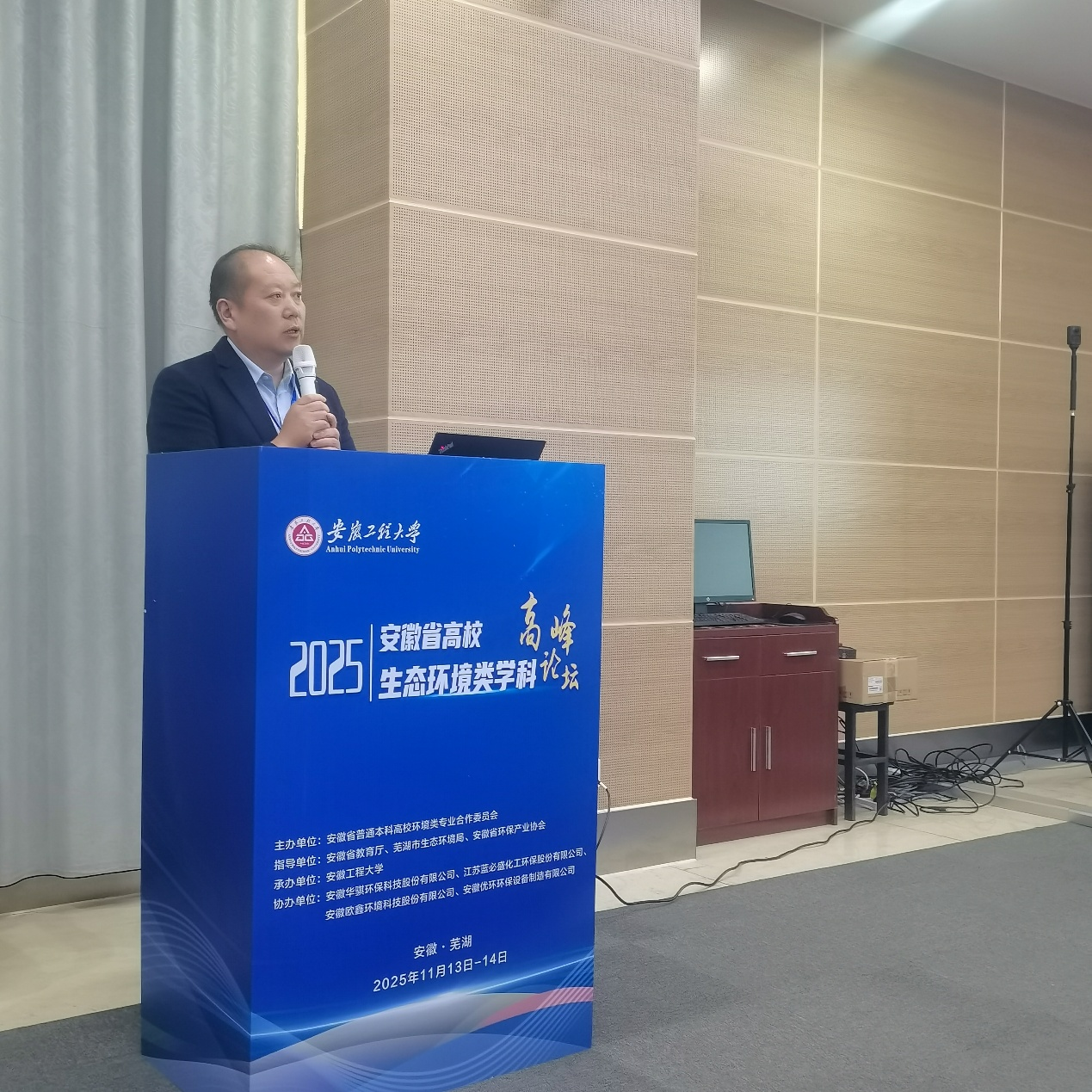 本网讯  11月14日,由安徽省普通本科高校环境类专业合作委员会主办、安徽工程大学承办的“2025年安徽省高校生态环境类学科高峰论坛”在芜湖顺利召开。安徽工程大学校长黄友锐教授,中国工程院院士、同济大学徐祖信教授(线上),中国工程院院士、中国科学技术大学俞汉青教授,安徽省教育厅高等教育处处长蒋正飞,安徽省环境保护产业协会常务副会长、秘书长张登亮,安徽省普通本科高校环境类专业合作委员会主任花日茂,芜湖市生态环境局督查专员王文婧,同济大学环境科学与工程国家级实验教学示范中心副主任刘佳教授等嘉宾出席。环能学院党委副书记、院长谢发之应邀带队参会并作报告。