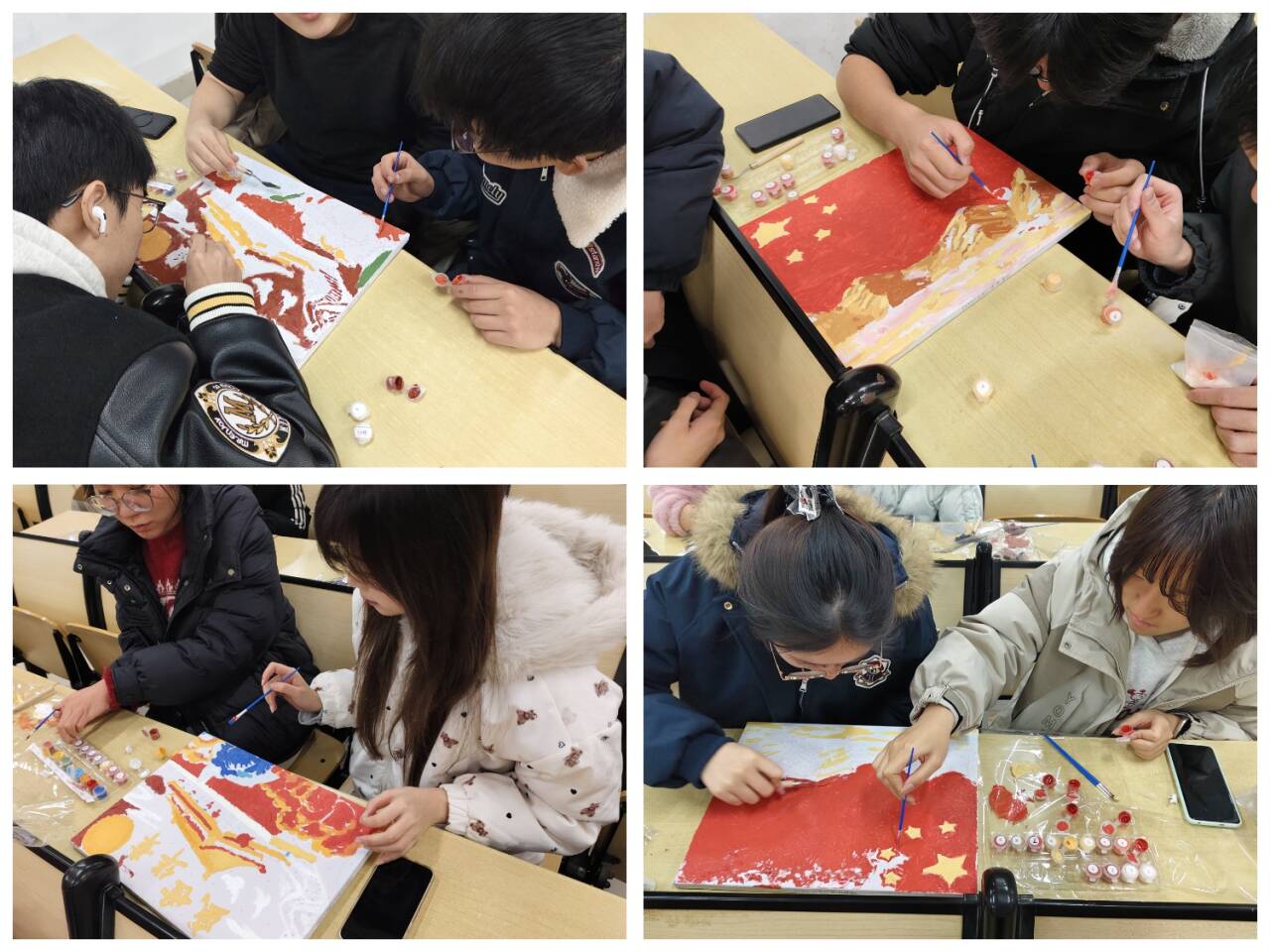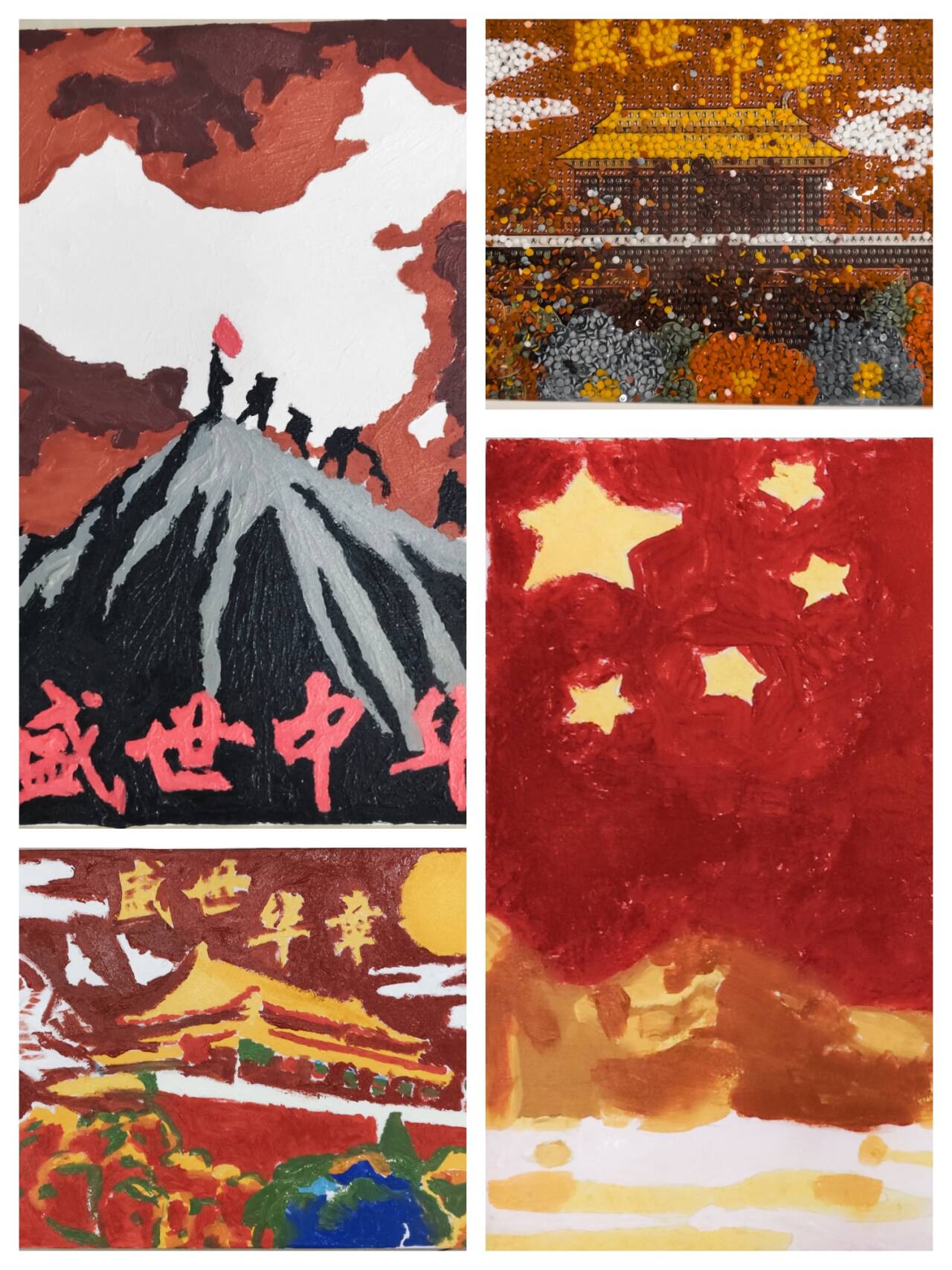 活动在庄重肃穆的氛围中开始。主持人首先阐述了国家公祭日的深刻意义,回顾那段沉痛历史,强调在和平年代更应铭记教训、自强不息。随后,同学们投入到肌理画与钻石贴画的创作中。画布上,庄严的天安门巍然矗立,鲜艳的五星红旗与绽放的繁花交相辉映,“盛世中华”的字样遒劲有力;一颗颗璀璨的钻石被精心贴嵌,点亮和平鸽的羽翼,缀出锦绣河山的光芒。指尖流转间,历史反思与时代礼赞融汇于构图与色彩之中。