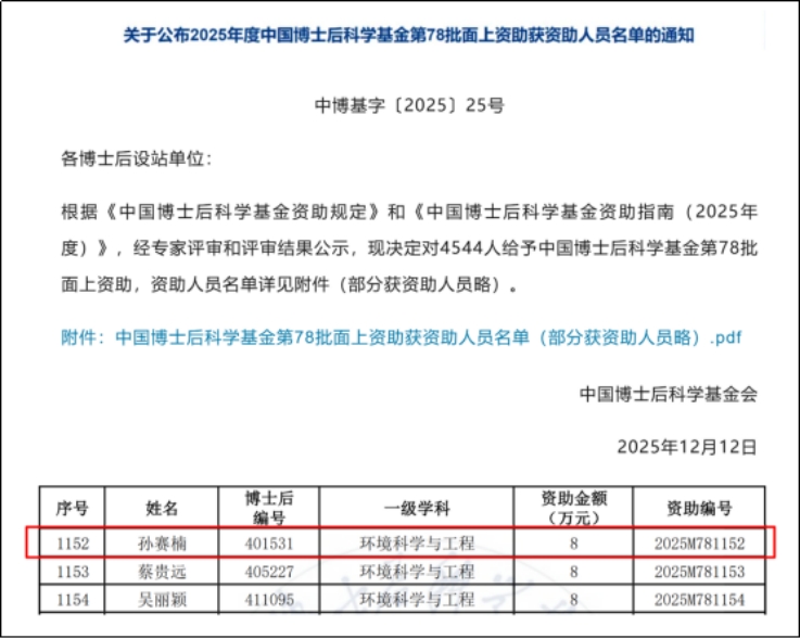 本网讯 近日,中国博士后科学基金会发布《2025年度中国博士后科学基金第78批面上资助获资助人员名单的通知》,beat365环境与能源工程学院博士后孙赛楠成功获得该项目资助。