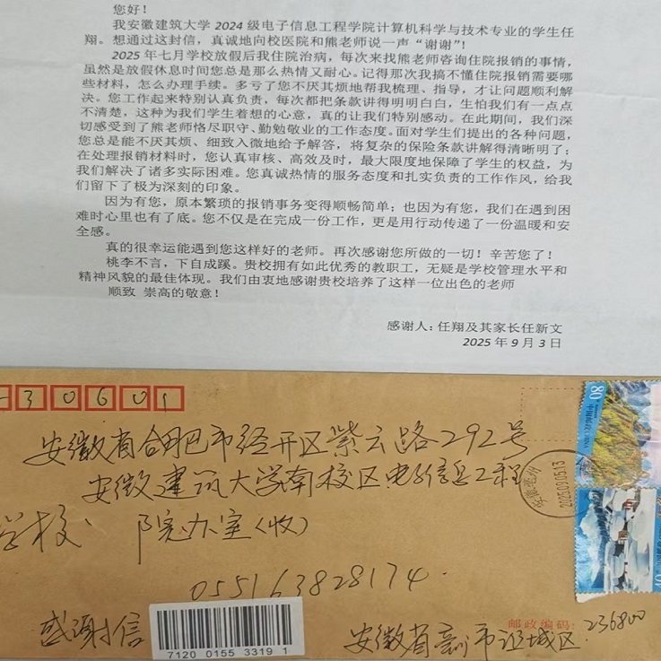 本网讯  近日,后勤管理处校医院收到一封来自2024级电信学院任同学及其家长寄来的感谢信,赞扬医务人员勤勉敬业的工作态度。信中不仅高度赞扬了校医院医务人员勤勉敬业的工作态度,更对医护人员耐心解答医药费报销政策、协助处理报销流程的细致服务表达了真挚谢意。
