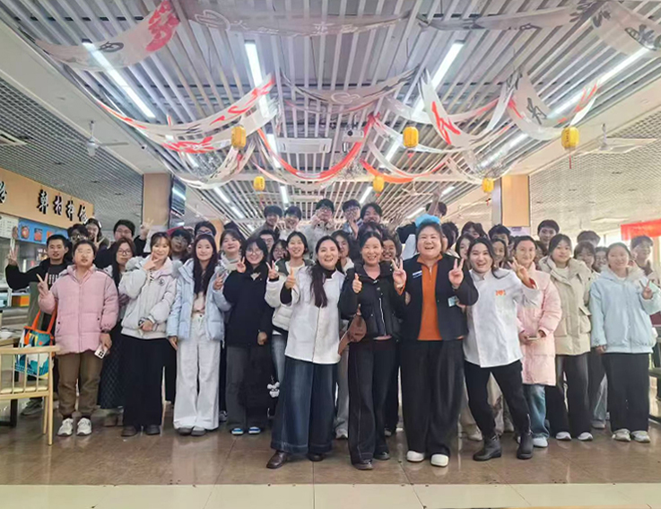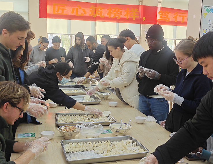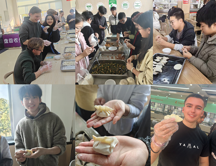 活动伊始,食堂工作人员已提前备好饺子皮、馅料以及饺子盘等各类工具,将大厅布置得整洁有序。同学们有序分组围站桌边,在工作人员的手把手指导下迅速投入活动——工作人员细致讲解包馅、捏褶技巧与馅料用量把控要点,亲自示范多样包法,助力新手快速上手。现场氛围热烈温馨,同学们热情高涨、分工协作,小心翼翼地完成包馅、捏合步骤,包出的饺子形态各异却饱含用心;工作人员穿梭其间答疑帮扶、互动交流,欢声笑语中满是饺香与温情。