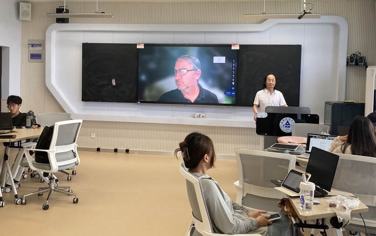 《宾馆环境设计》由美方Stephen Skorski教授和艺术学院杨自龙老师共同授课。早在课程开始前,双方教学团队已就授课细节进行多轮沟通。本周起,同学们在刚刚投入使用的智慧教室与Skorski教授连线上课。课堂上,两位老师相互配合,与同学们实时交流。同学们认真听课,积极思考,努力开拓创造性设计思维。