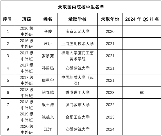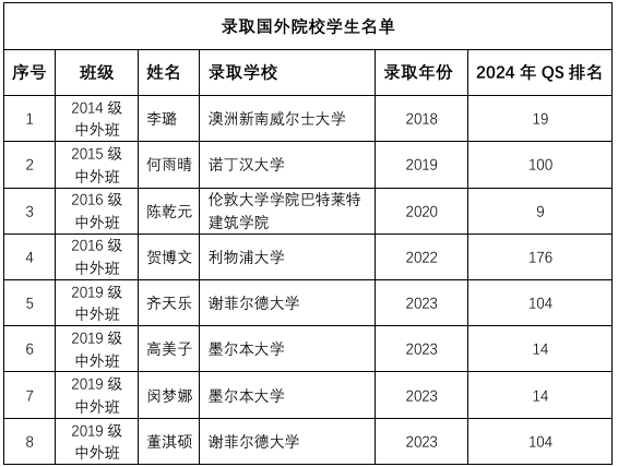 本网讯 环境设计中外合作项目自2014年9月获得教育部批准以来,学院高度重视该项目学生的教育教学、出国留学、考研升学工作,深化教学改革,加强学风建设,努力提高人才培养质量。既重视公共课、专业基础课程、专业核心课程教学,也重视英语口语及写作课程教学,每年邀请多名外教授课,以帮助出国的学生尽快适应国外教学环境。同时强化对考研学生的教育和服务工作,每年开设考研英语备考指导、考研报考指导、考研经验分享会、留学经验分享会等,为中外合作项目学生营造良好的备考环境。近年来,环境设计中外合作项目学生考研氛围逐渐浓厚,报考人数和成绩呈逐年攀升态势,被国内院校录取的人数有所突破,被国外院校录取的人数也稳步提升。以下为近年来考研录取学生名单: