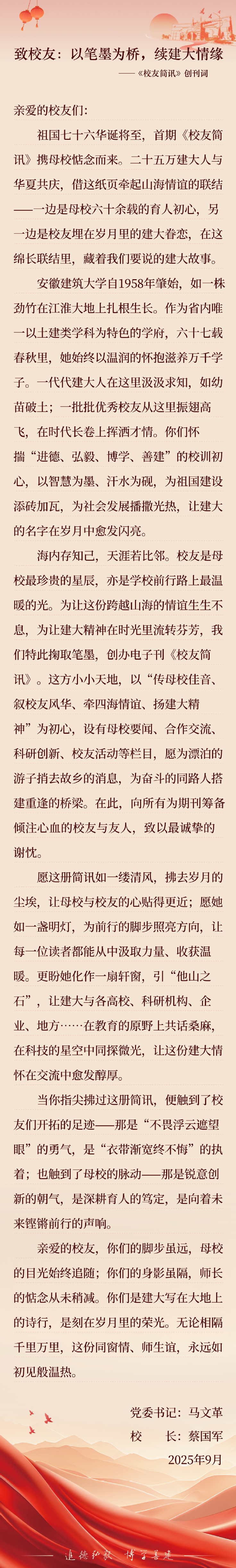 校友简讯的诞生,源于母校对校友的深情惦念,更旨在构建一个“信息互通、情感互联、发展互促”的精神家园。简讯设有“母校要闻、合作交流、产学研用、莘莘学子、校友之窗”栏目。其中“母校要闻”着眼于建大在高质量发展道路上的坚实步履;“合作交流”展现着母校开放办学的广阔格局;“产学研用”聚焦建大人服务国家战略的责任担当;“莘莘学子”见证后辈传承建大精神的蓬勃朝气;“校友之窗”则搭建了专属于建大人的风采舞台。我们同样诚挚期盼全体校友提笔供稿,让每份牵挂都化作联结彼此的情感纽带。