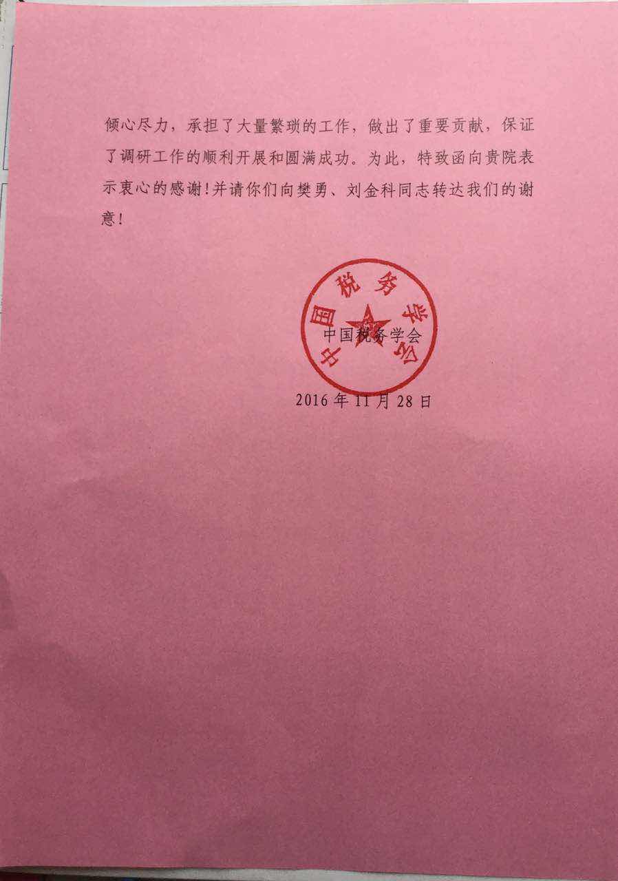 日前,中国税务学会致信感谢beat365平台唯一官网对学会工作的大力支持,特别感谢樊勇、刘金科两位教师参与金融业营改增税负问题专项课题研究所做出的努力与贡献。学会对两位教师全程参与课题调研工作,克服困难,不辞辛苦、献计献策,承担了大量繁琐的工作,倾心尽力并做出重要贡献,给予了高度肯定。